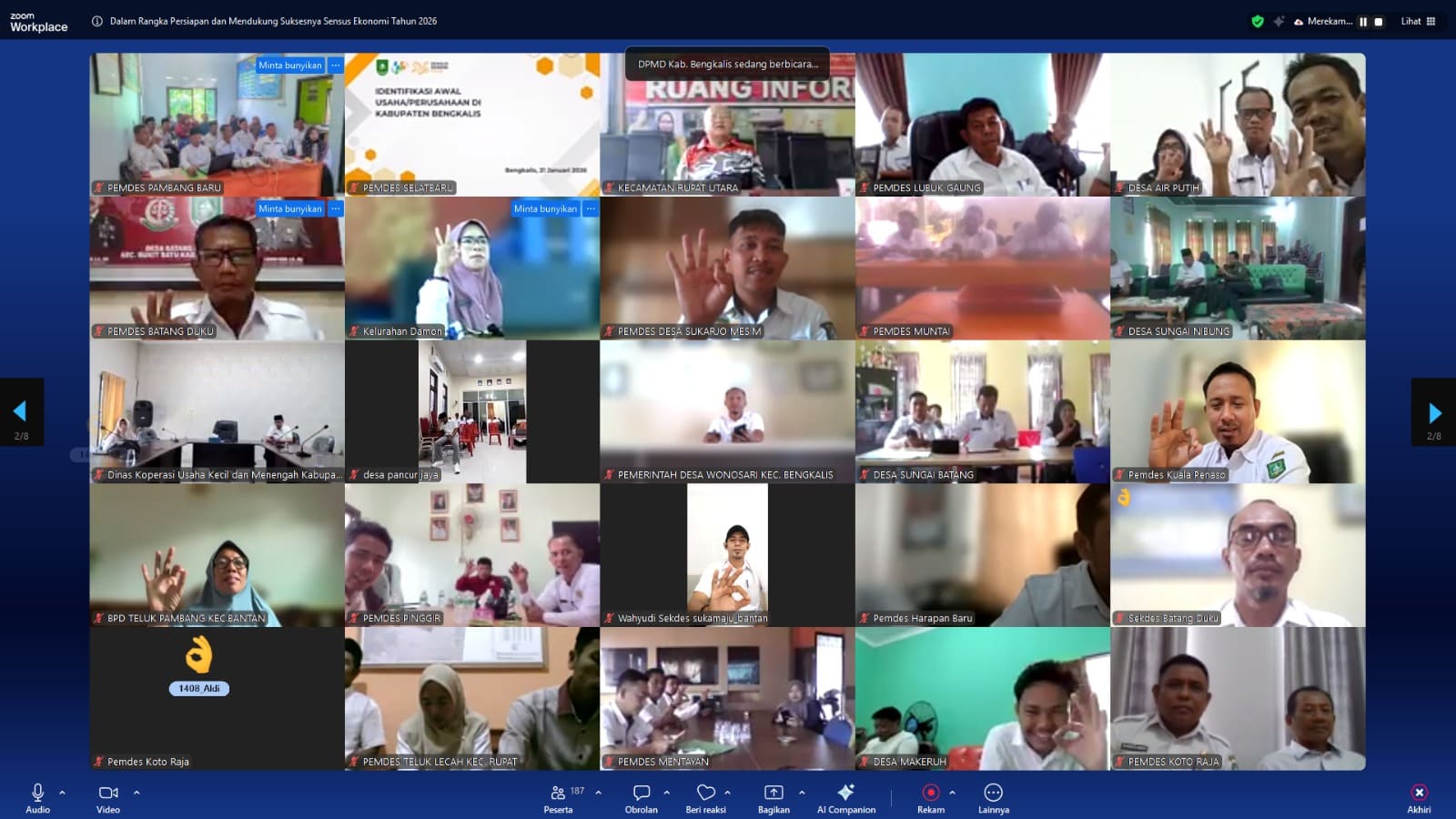 BENGKALIS-DPMD_ Drs. H. Ismail, MP mewakili Bupati Bengkalis, Kasmarni, S.Sos., M.MP membuka Kegiatan Sosialisasi Pelaksanaan Sensus Ekonomi 2026 Kabupaten Bengkalis secara Daring di Aula Dinas Pemberdayaan Masyarakat dan Desa Kabupaten Bengkalis pada Rabu, 21 Januari 2026.
